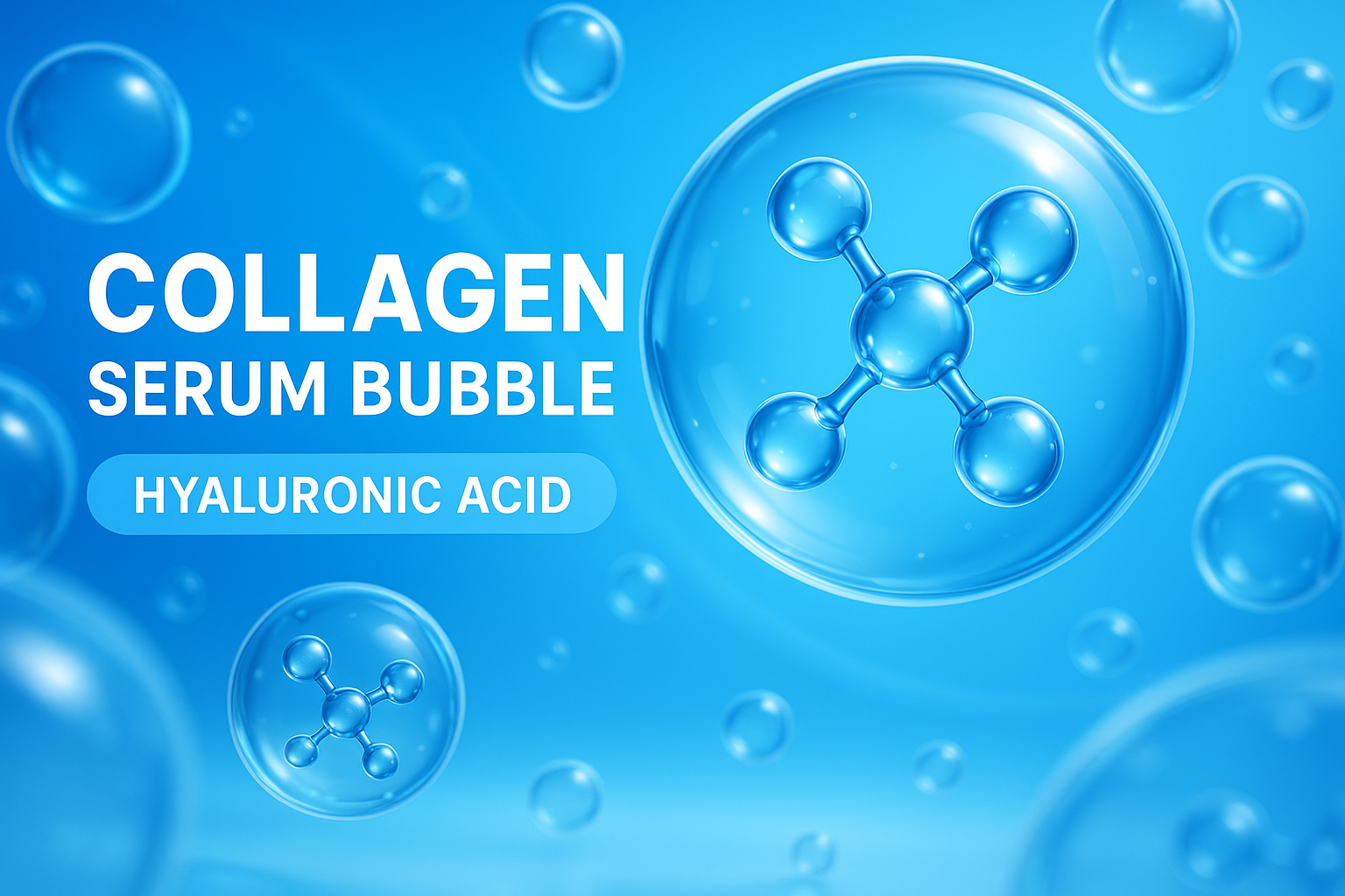 /Collection: /by davooda/Type: PNG/A visually appealing graphic featuring collagen serum bubbles and molecular structures, designed for skincare product promotion. The vibrant blue background enhances the modern aesthetic.
