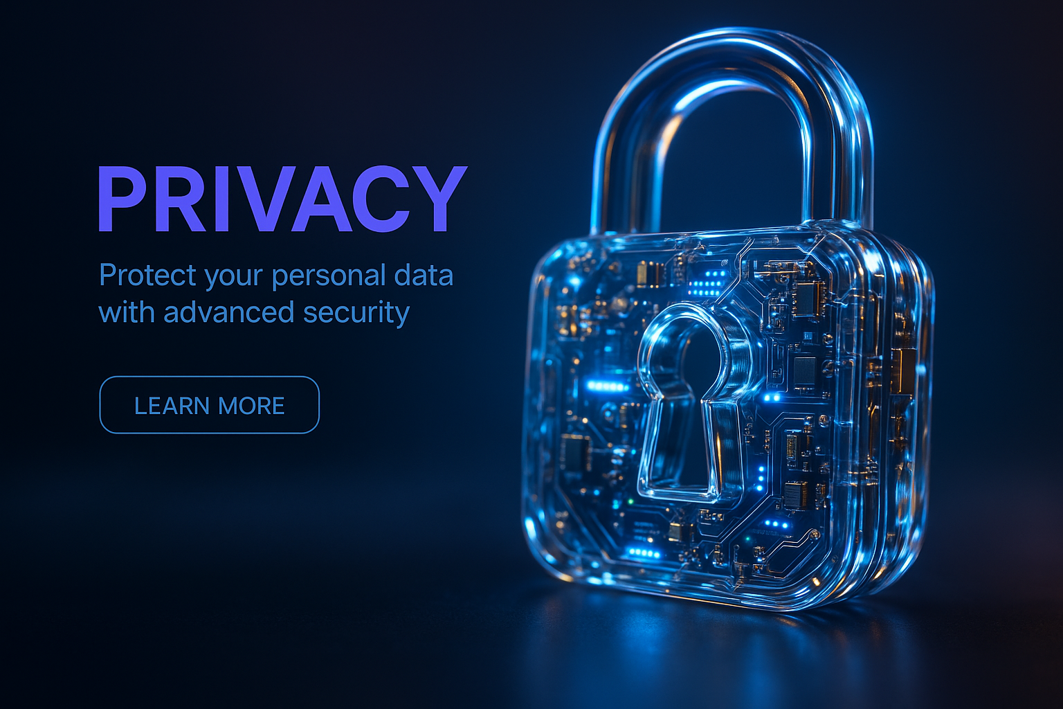 /Collection: /by davooda/Type: PNG/A hyperrealistic 3D depiction of a lock symbolizing privacy, featuring clear glass-like materials and glowing micro-LEDs. The intricate design includes metallic components and a soft neon glow.