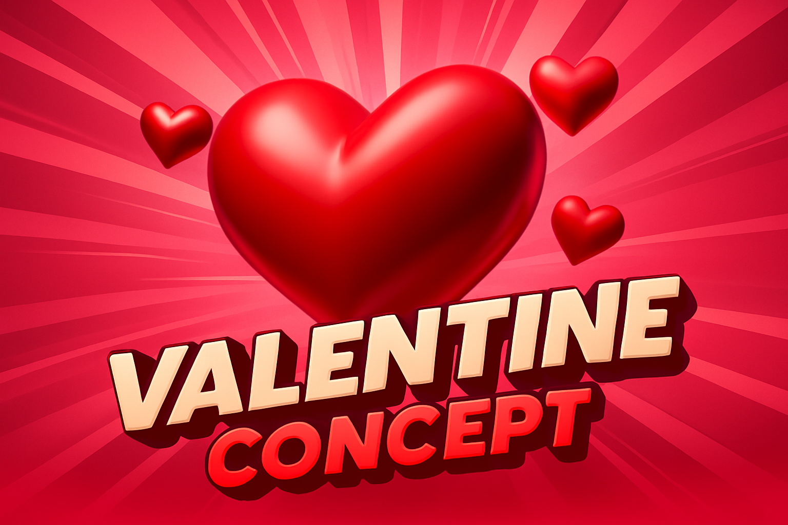 A vibrant 3D illustration of a red heart, prominently displayed against a pink gradient background, surrounded by smaller hearts and dynamic rays, perfect for Valentine's Day themes.