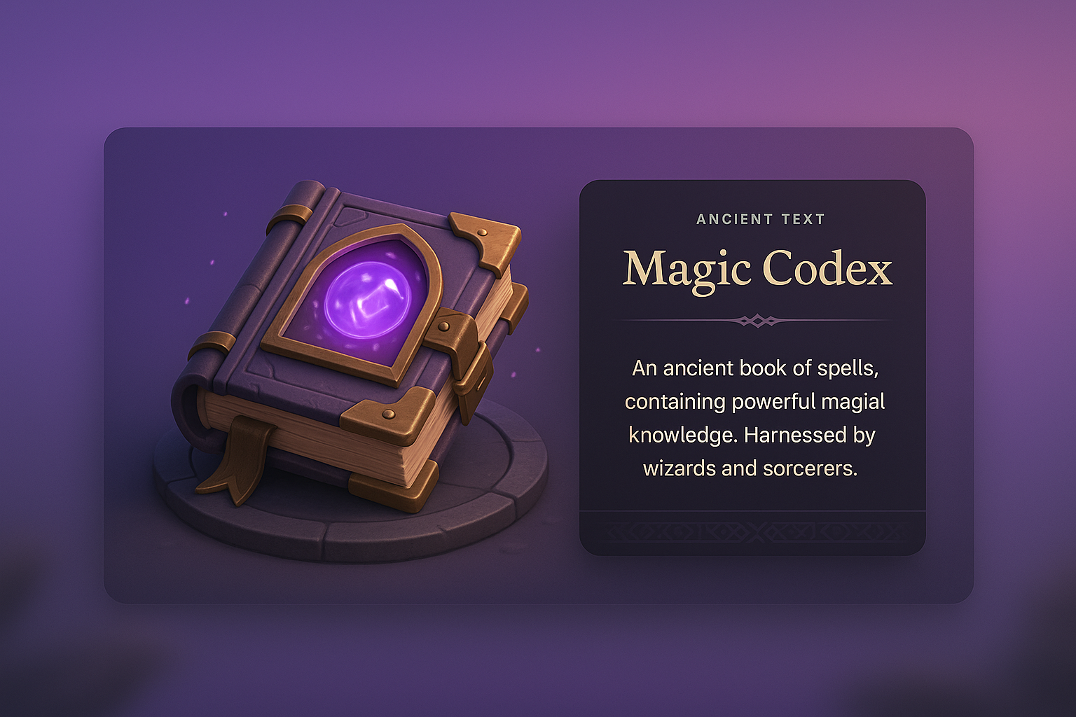 A visually striking 3D illustration of an ancient magic codex, featuring a glowing gem and ornate detailing. The design integrates a dark panel with descriptive text.