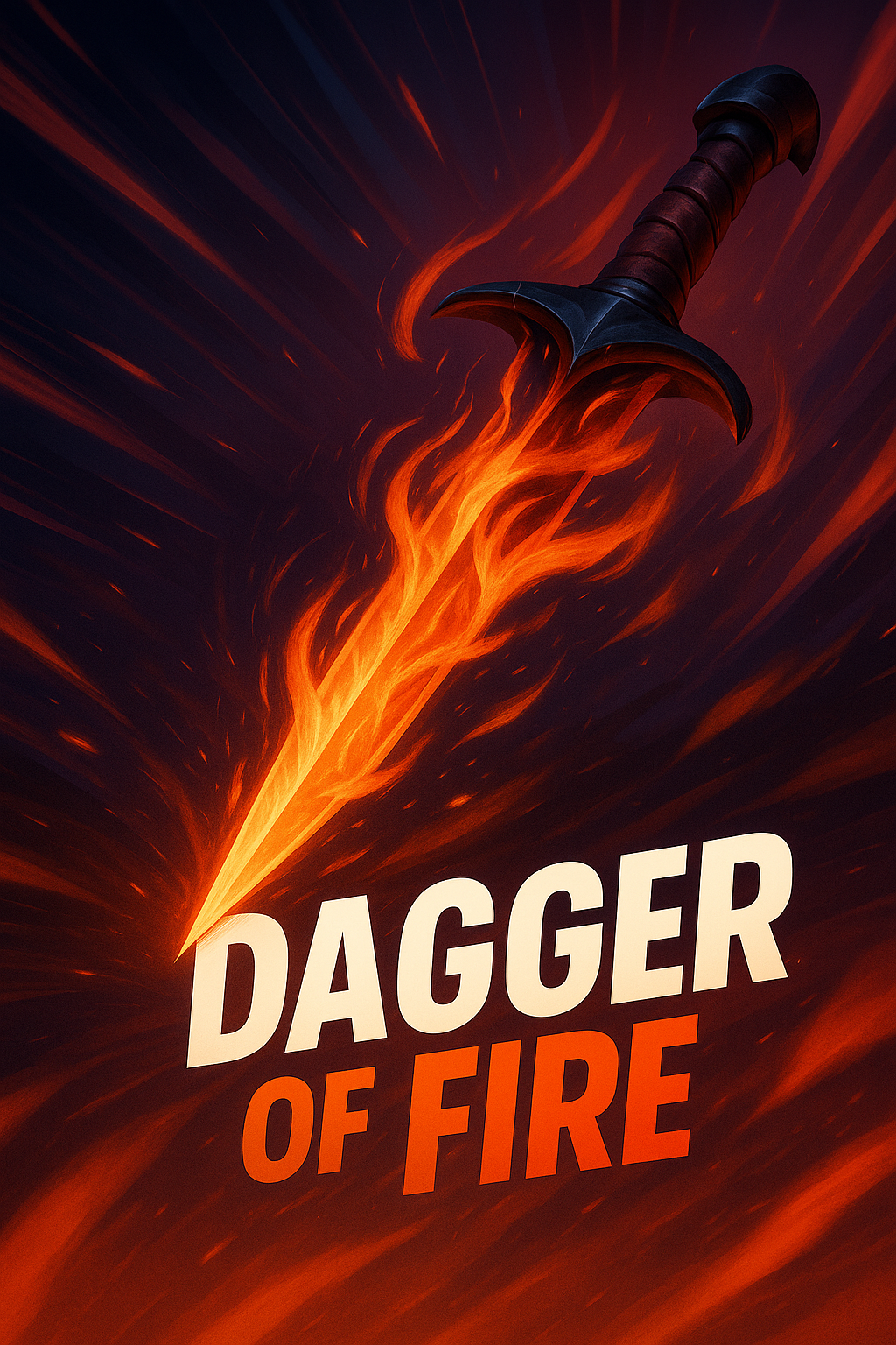 /Collection: /by davooda/Type: PNG/A visually striking illustration of a dagger engulfed in fire, with dynamic lines radiating from its center. The title 'Dagger of Fire' is prominently displayed in bold, contrasting colors.