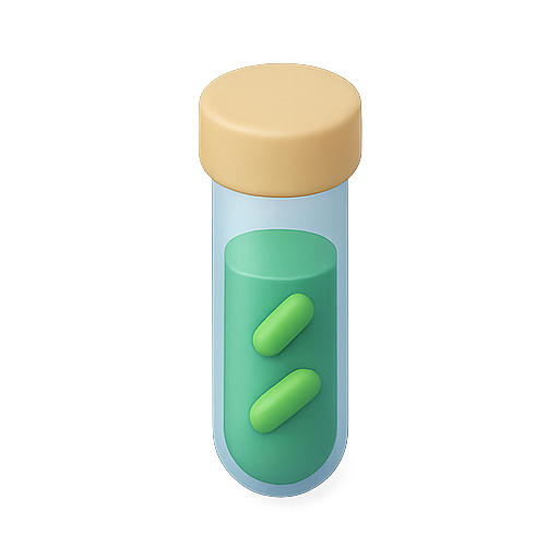 A modern, stylized icon representing a laboratory test tube containing green liquid and capsules, ideal for health and science-related applications.