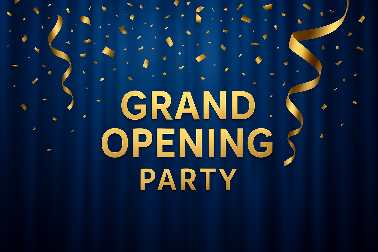 Grand Opening Celebration with Golden Confetti and Blue Background
