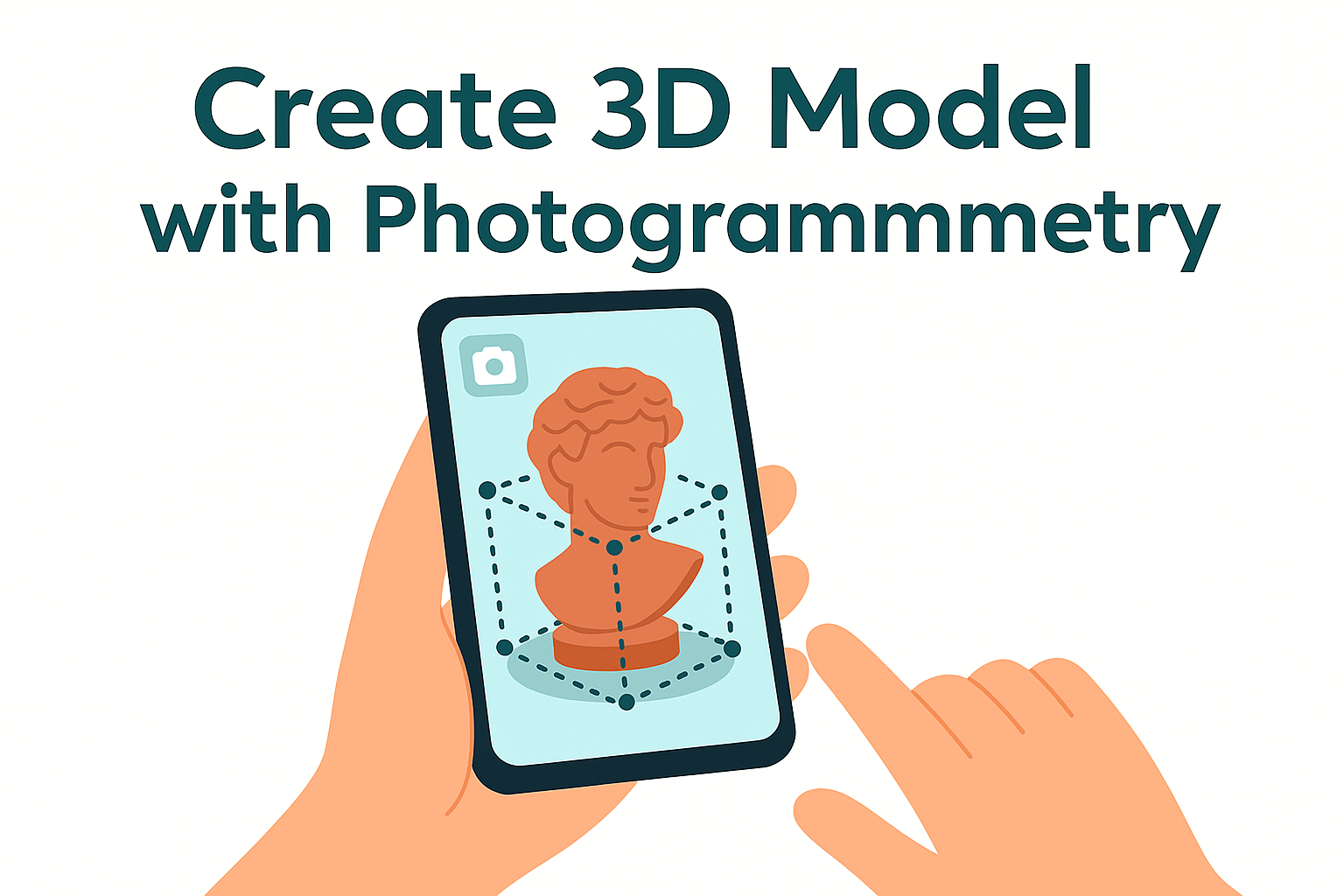/Collection: /by davooda/Type: PNG/Informative graphic illustrating the process of creating 3D models via photogrammetry, featuring a smartphone displaying a 3D bust. Ideal for educational content in technology and design.