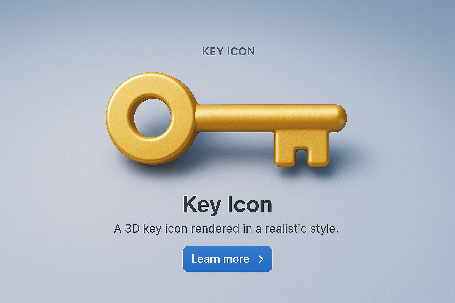 A detailed 3D rendering of a golden key icon, set against a smooth gradient background. The design includes a small label, a brief headline, and an action button, all in a cohesive layout.