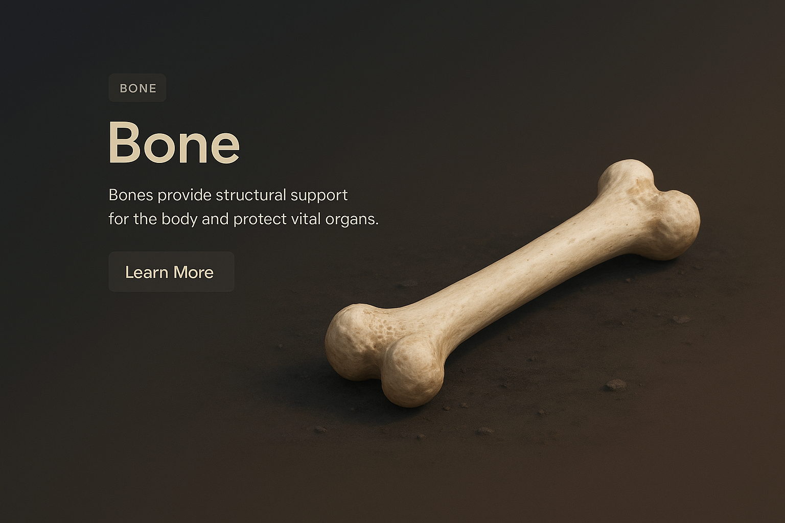 A detailed 3D depiction of a bone, set against a dark gradient background. The design includes informative text and a button, emphasizing structural support.