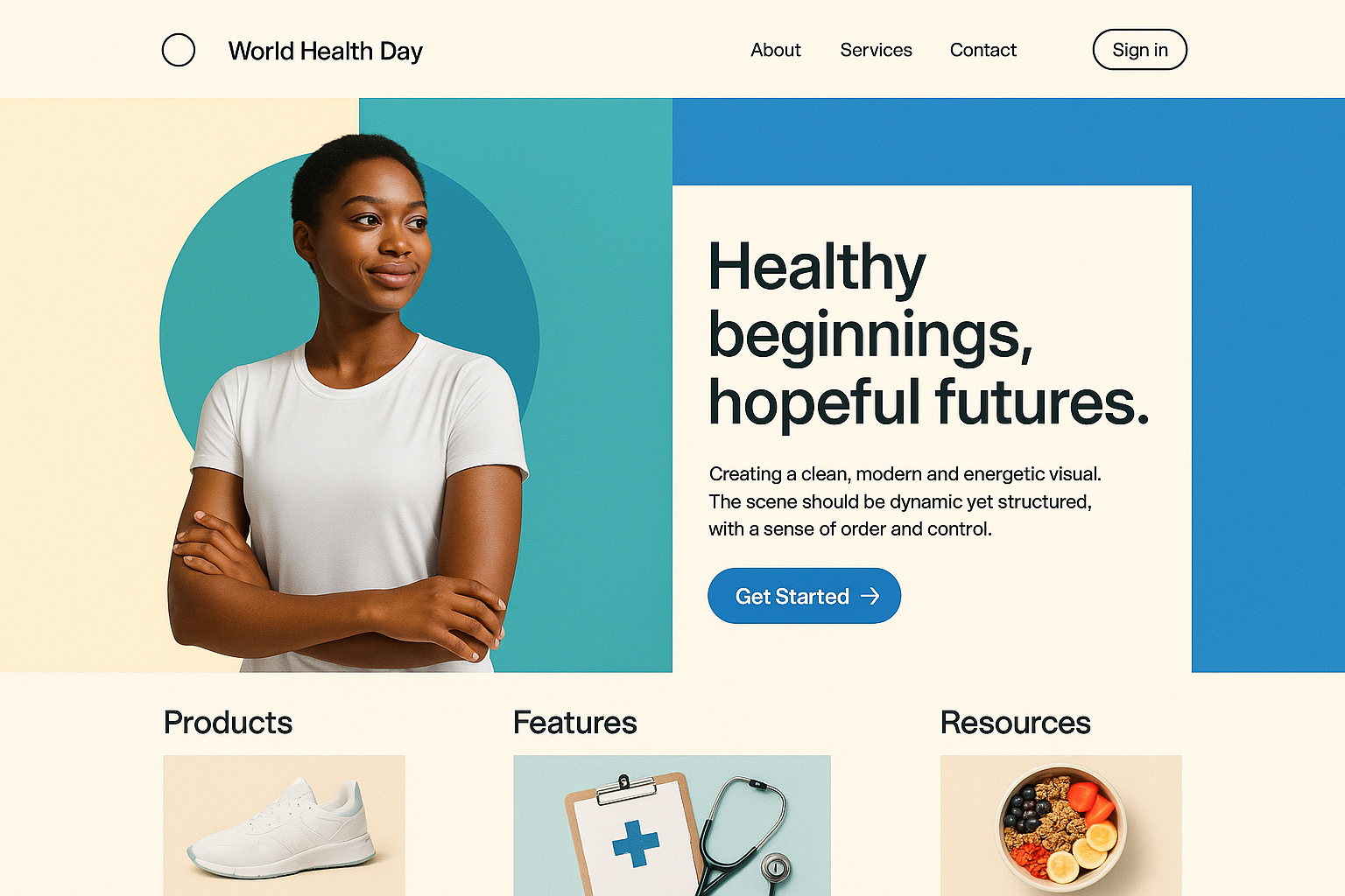 /Collection: /by davooda/Type: PNG/A clean and modern landing page design for World Health Day, featuring a structured layout with vibrant color blocks, dynamic typography, and engaging visuals.