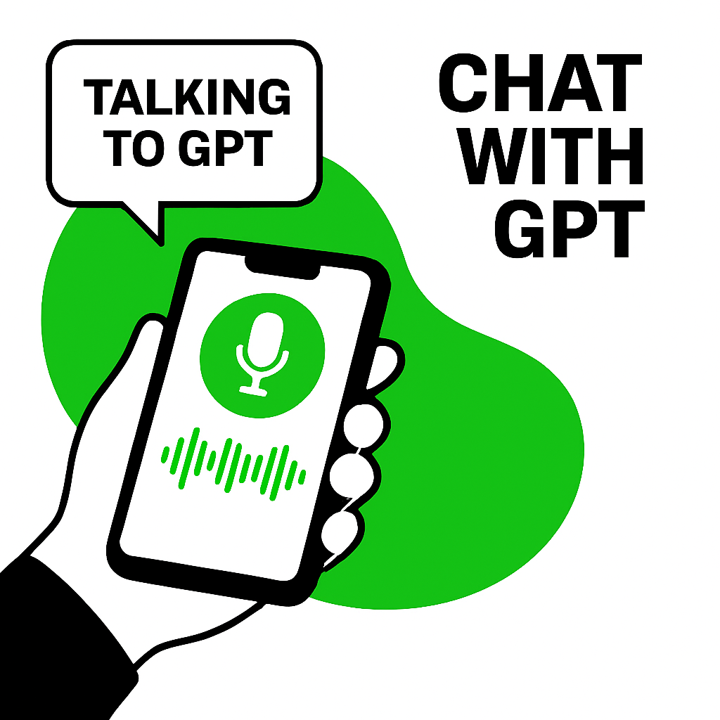 /Collection: /by Sergey Leonov/Type: PNG/Modern graphic depicting a smartphone displaying a voice chat feature for AI interaction. The design is bold and vibrant, suitable for tech-related promotions.