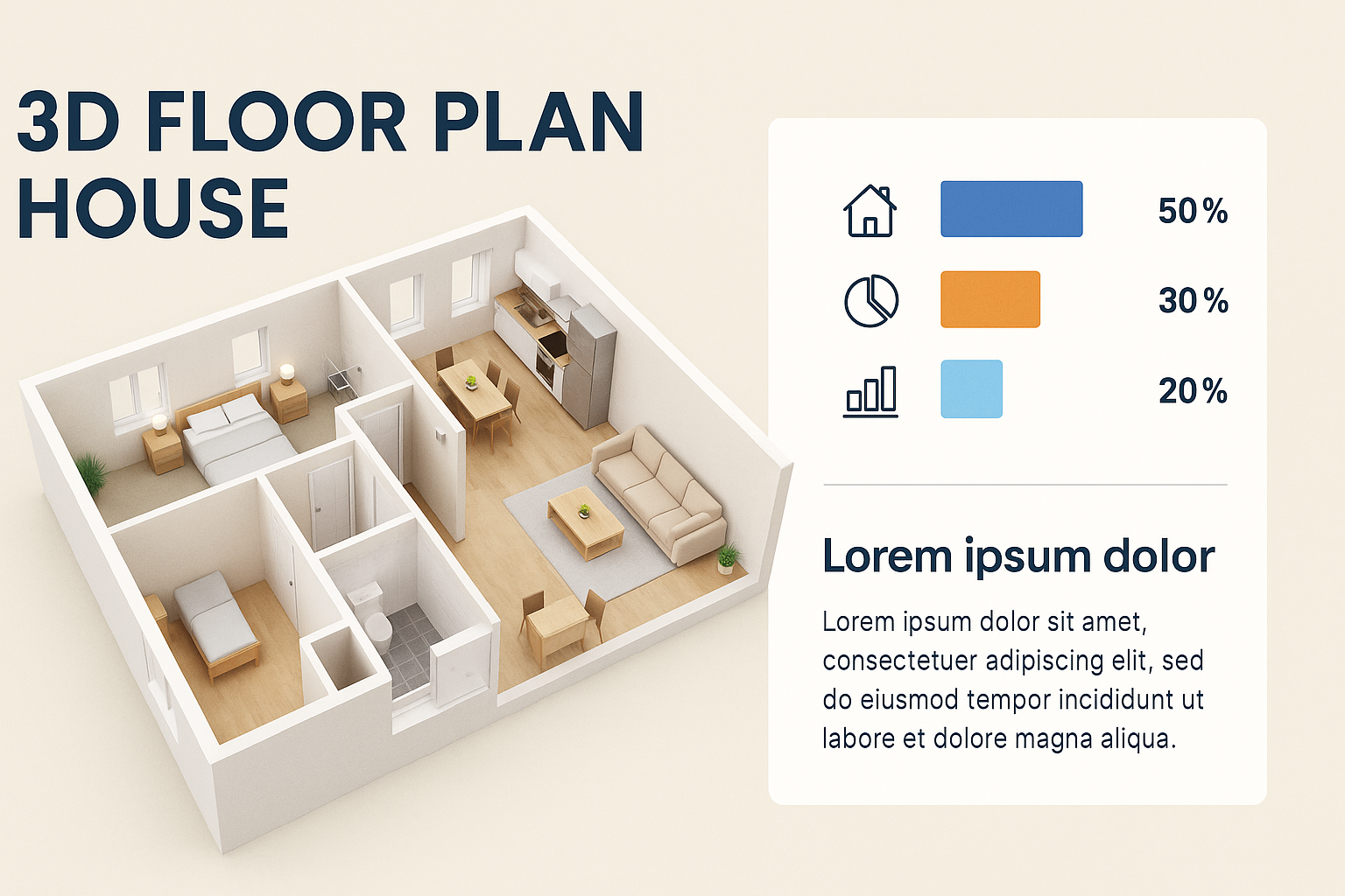 /Collection: /by davooda/Type: PNG/Detailed 3D floor plan illustration showcasing a house layout, ideal for real estate marketing and architectural presentations. The design includes labeled areas for room distribution and spatial arrangement.
