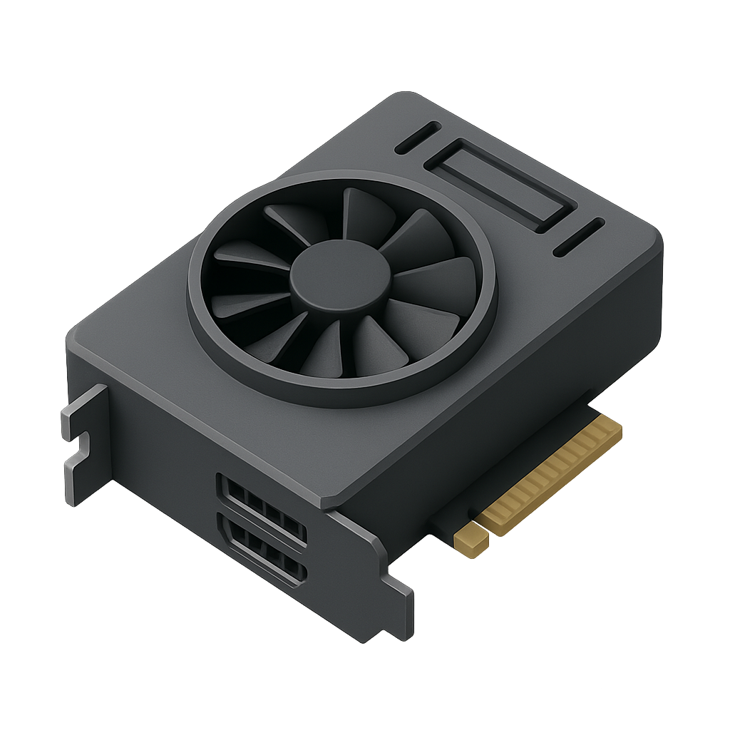 A sleek 3D rendering of a graphics processing unit, featuring a fan and connectors, designed with an isometric perspective and a transparent background for a modern look.