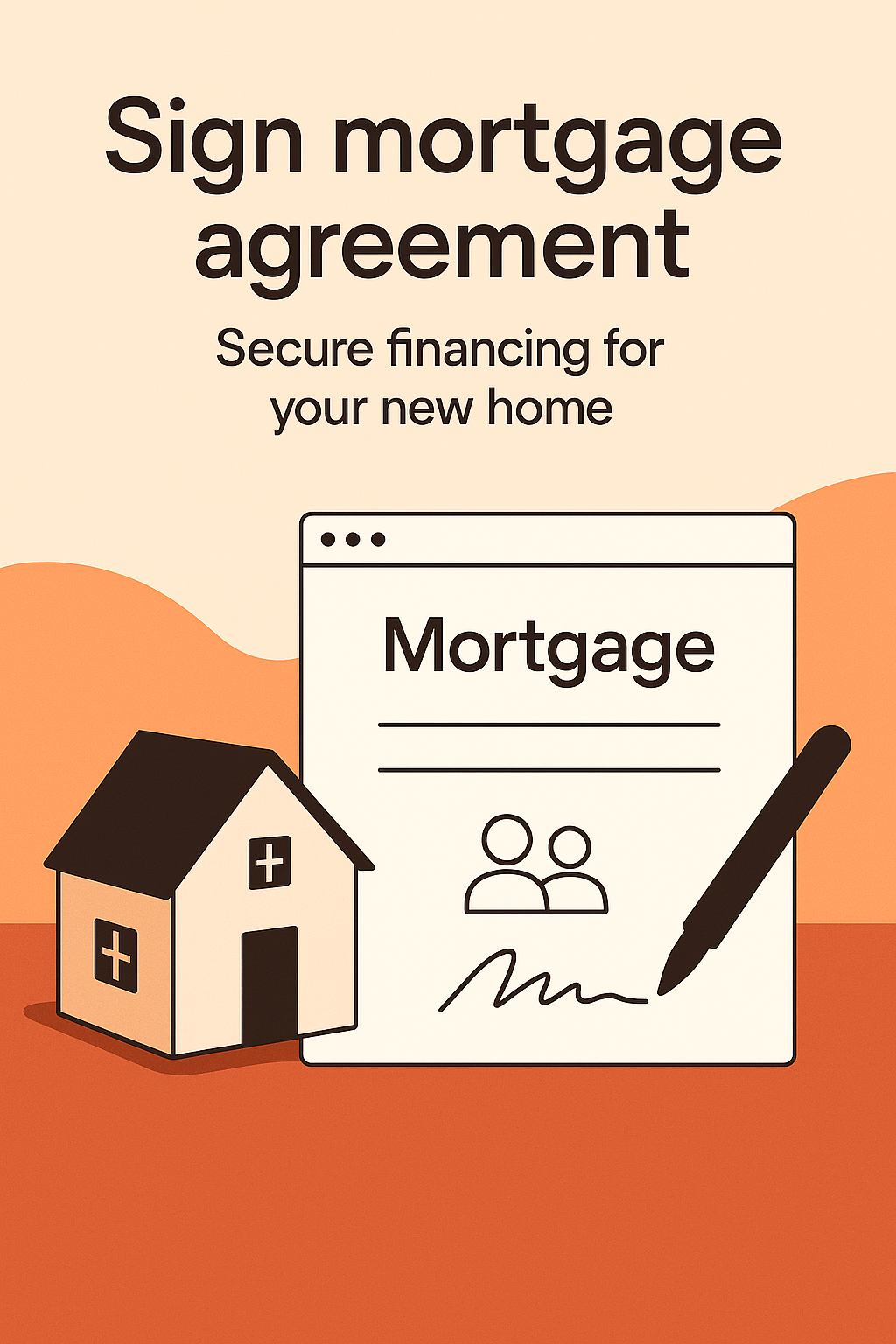 /Collection: /by davooda/Type: PNG/A visually engaging illustration depicting the signing of a mortgage agreement, featuring a house and document. Ideal for real estate marketing and finance-related content.