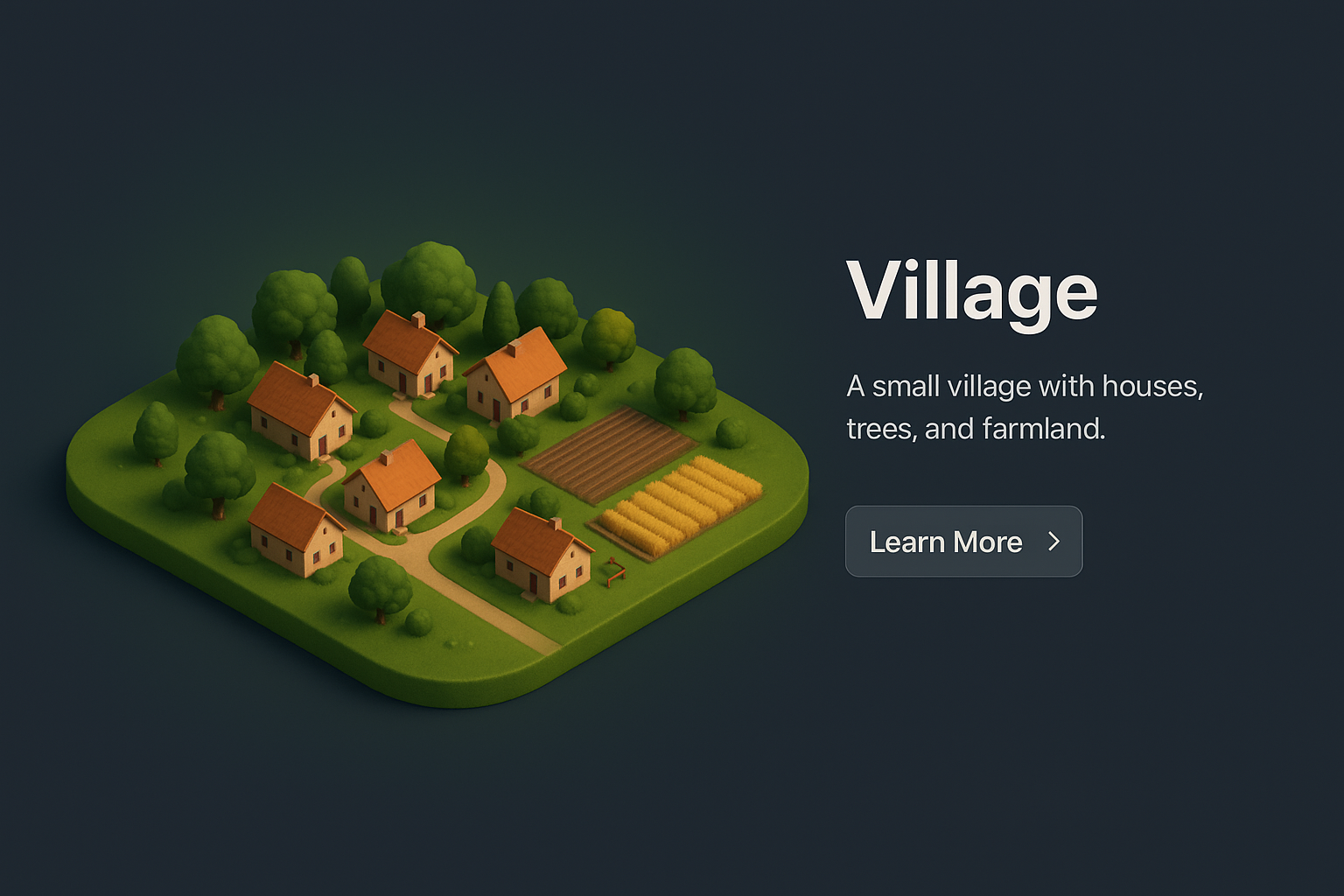 /Collection: /by davooda/Type: PNG/A realistic 3D representation of a small village, featuring cozy houses, trees, and farmland, set against a dark gradient background. The scene emphasizes a zoomed-out perspective.