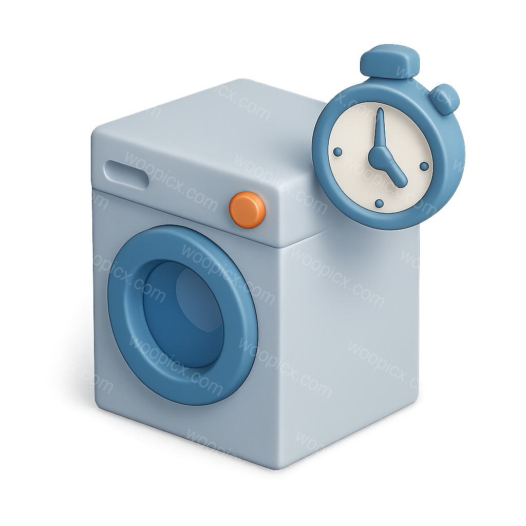 A visually appealing 3D icon of a washing machine featuring a timer. Designed with a transparent background, it showcases a three-quarter view for a modern look.