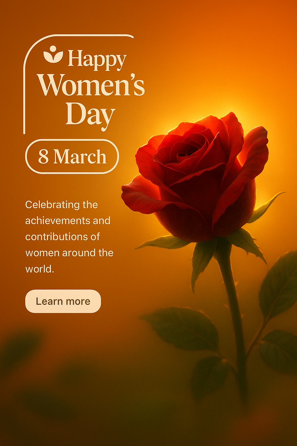 A digital graphic for Women's Day featuring a beautiful rose against an orange backdrop. It's designed for social media or promotional use, celebrating women's achievements.