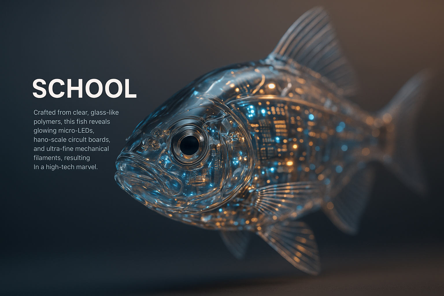 This hyperrealistic image depicts a fish crafted from glass-like polymers, showcasing intricate internal components like micro-LEDs and circuit boards. The soft lighting emphasizes its glowing features.