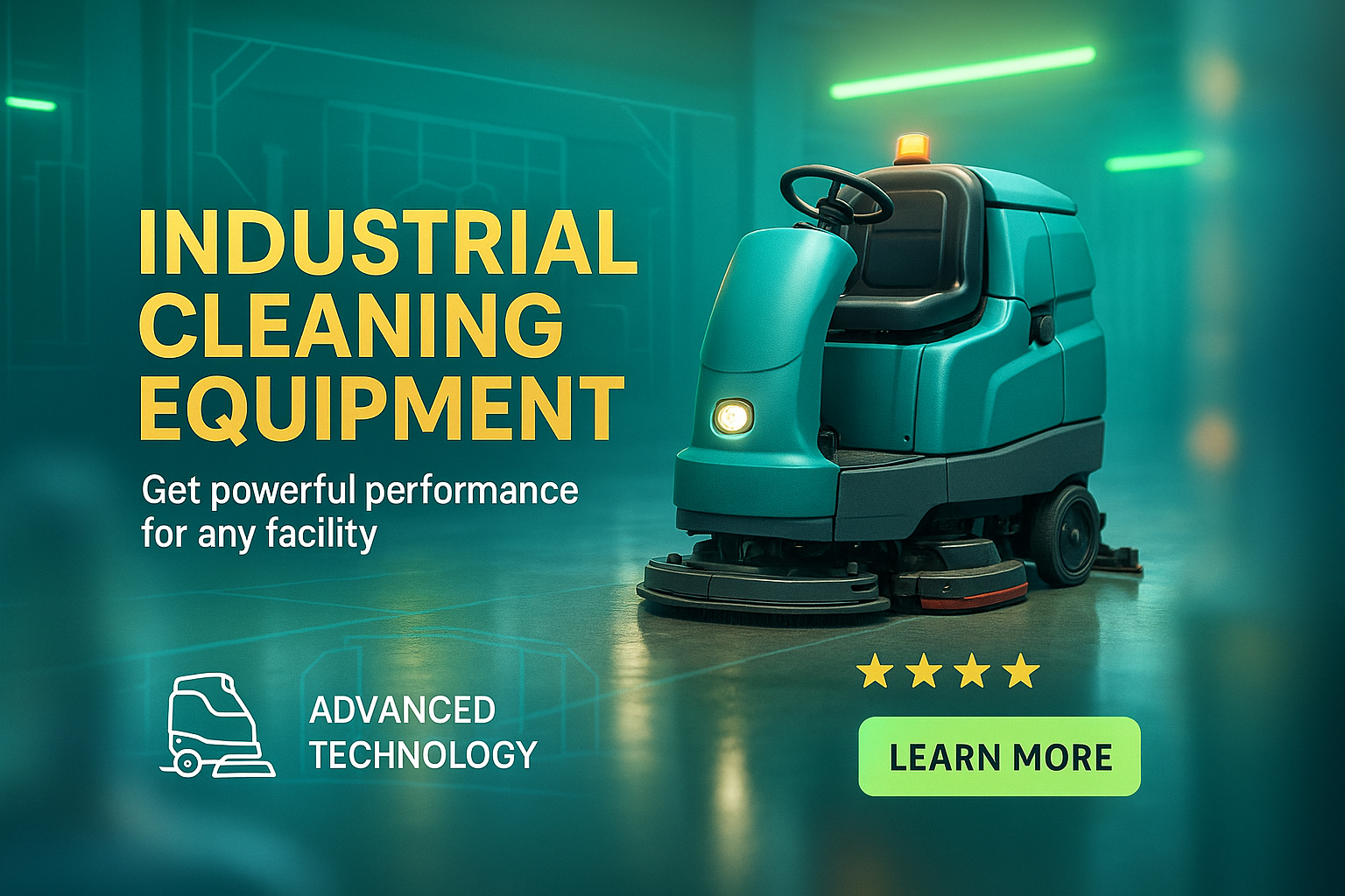 /Collection: /by davooda/Type: PNG/A modern promotional graphic showcasing industrial cleaning equipment with a sleek design, aimed at businesses seeking high-performance solutions for facility maintenance.
