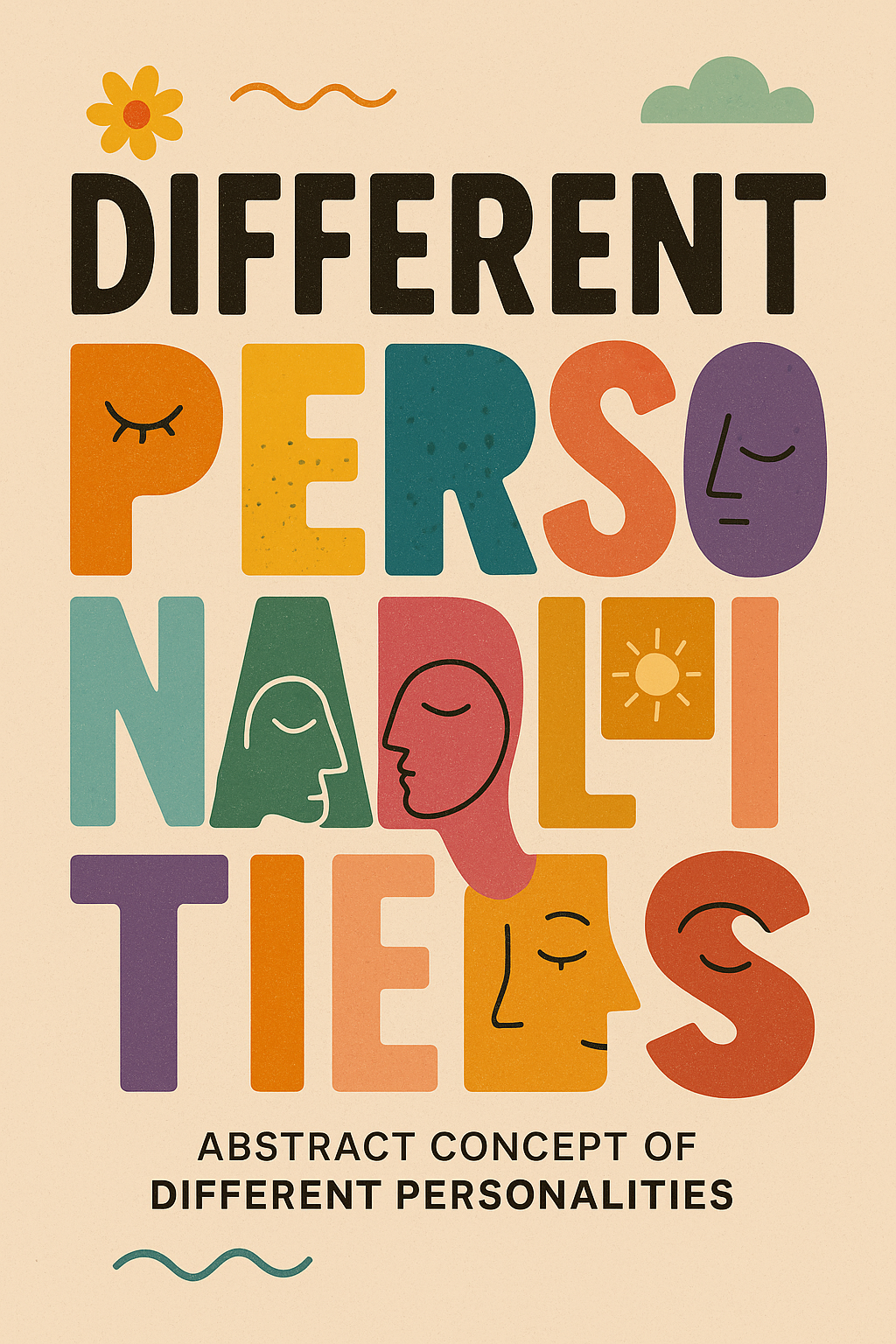 /Collection: /by davooda/Type: PNG/Vibrant graphic illustrating the concept of diverse personalities with playful typography and abstract facial outlines, suitable for psychological or artistic themes.
