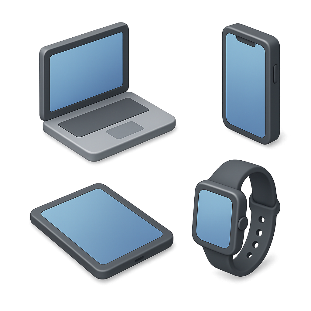 /Collection: /by davooda/Type: PNG/A collection of 3D icons showcasing various electronic devices including a laptop, smartphone, tablet, and smartwatch, all presented in a sleek, isometric style.