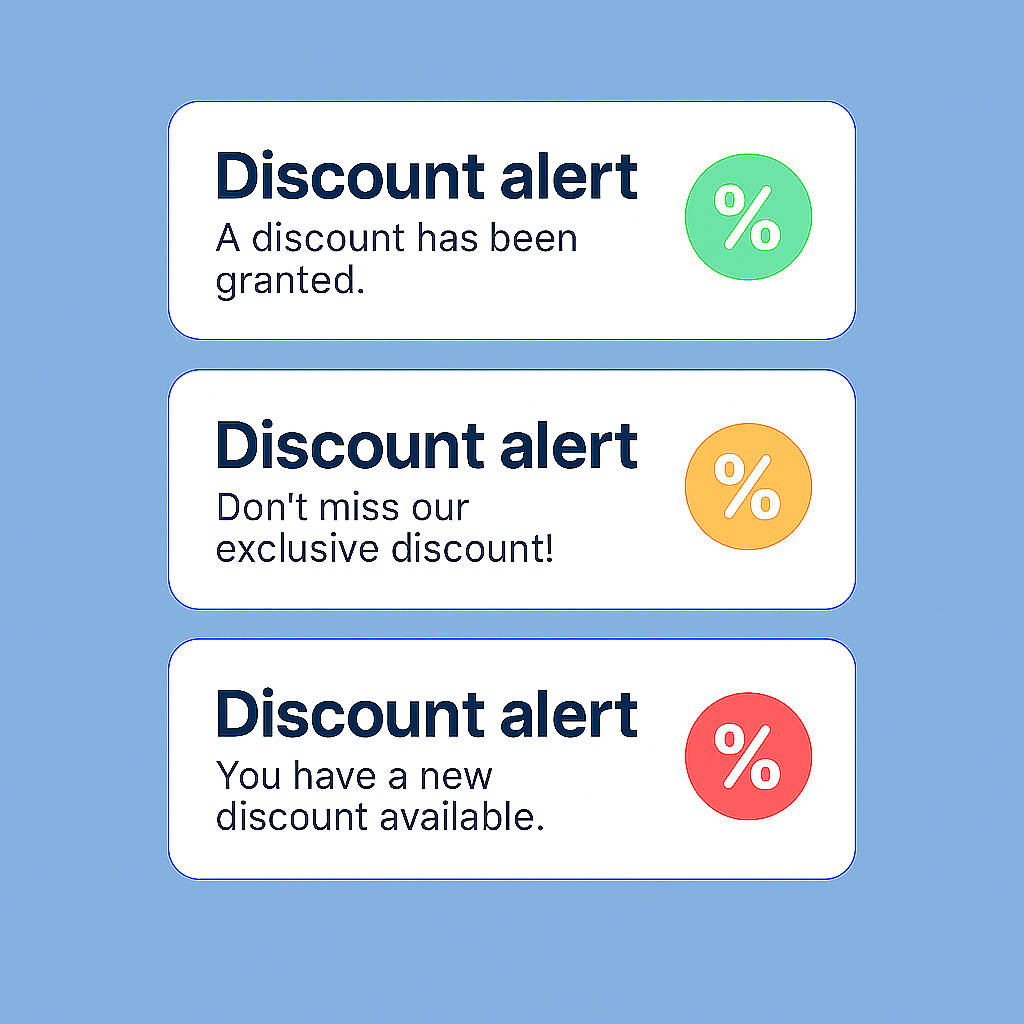 Set of discount alert notification cards featuring colorful design elements. Ideal for marketing campaigns and promotional announcements.