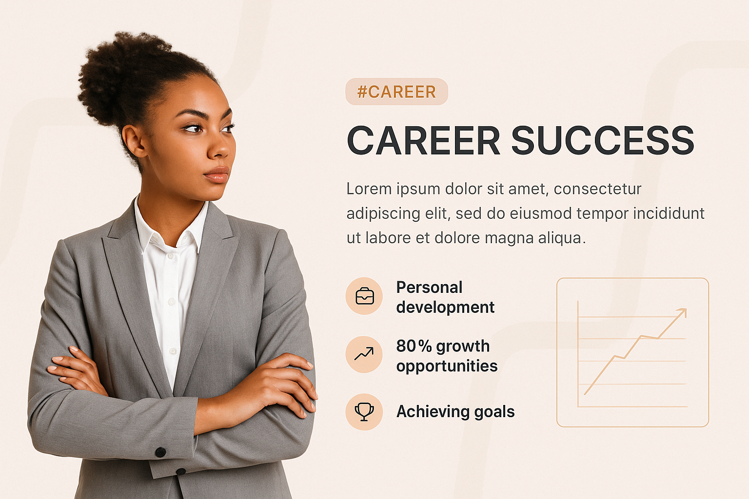 Modern promotional graphic focused on career success, featuring an individual in professional attire against a soft background. Ideal for career development content and workshops.