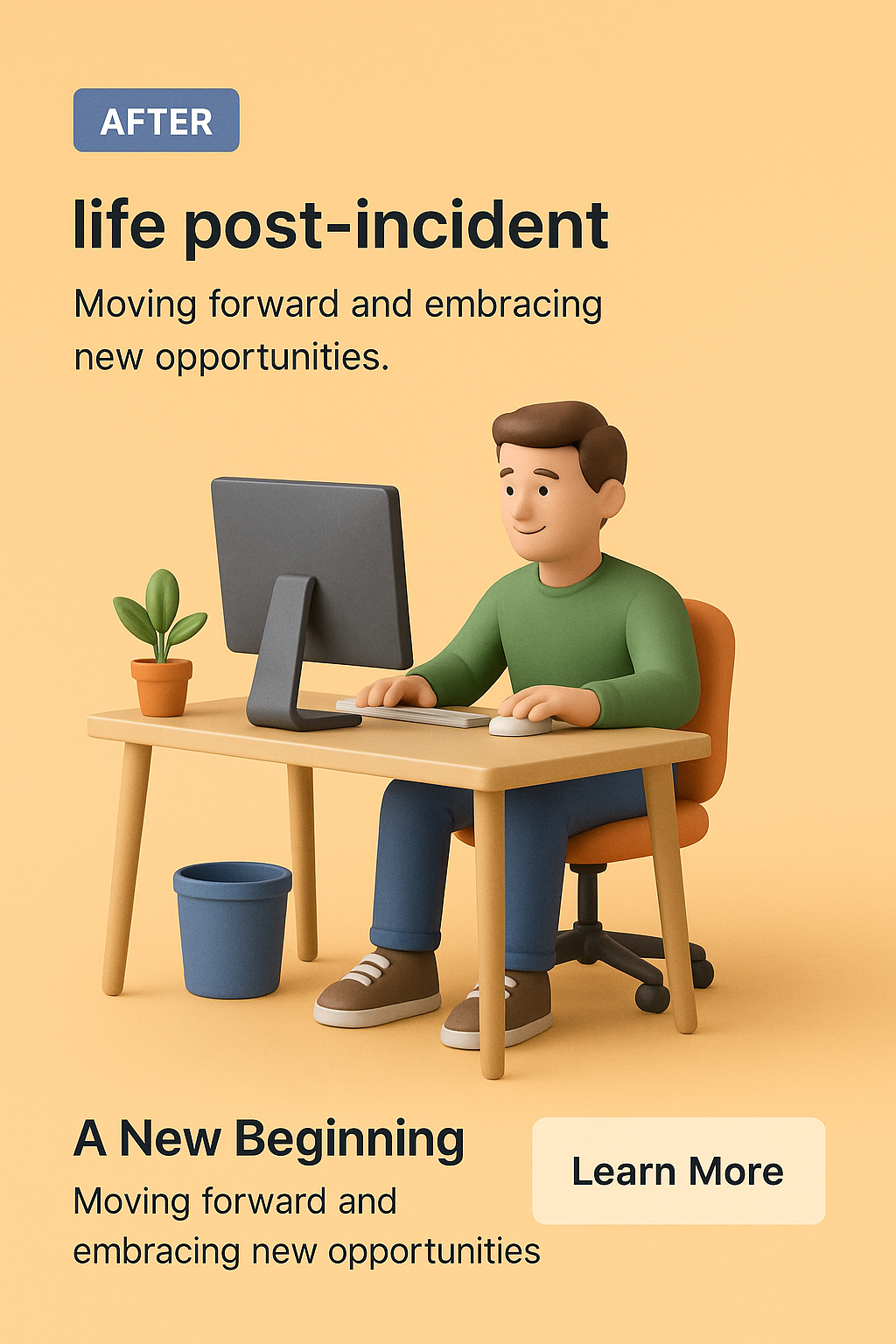 A 3D illustration showing a person at a desk, symbolizing new beginnings after an incident. The scene includes a computer, a plant, and a text block encouraging progress.
