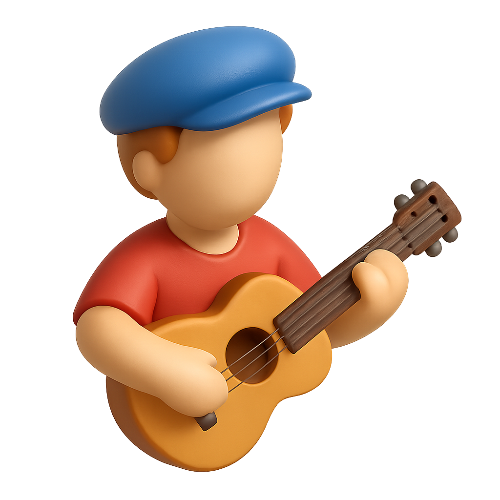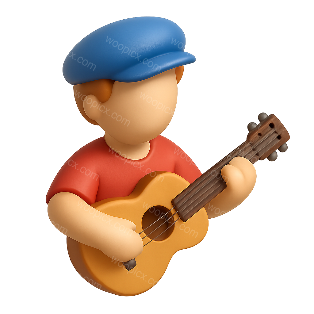 A stylized 3D icon of a band member playing a guitar, featuring a character with a blue cap and red shirt. The design has a transparent background and an isometric perspective.