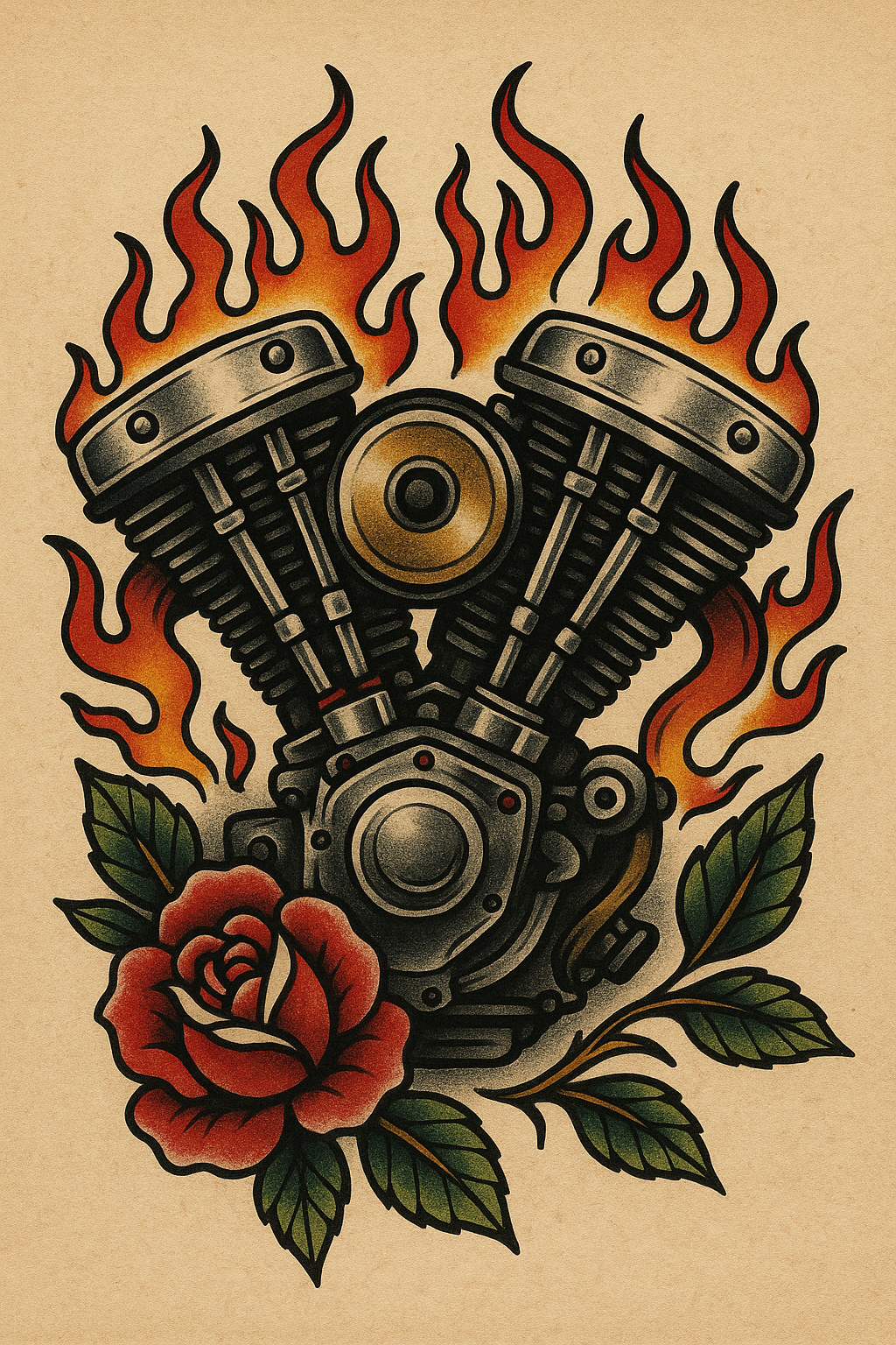 /Collection: /by davooda/Type: PNG/This image features a detailed illustration of a motorcycle engine surrounded by flames and roses, showcasing a vintage tattoo style. Ideal for automotive or biker culture.