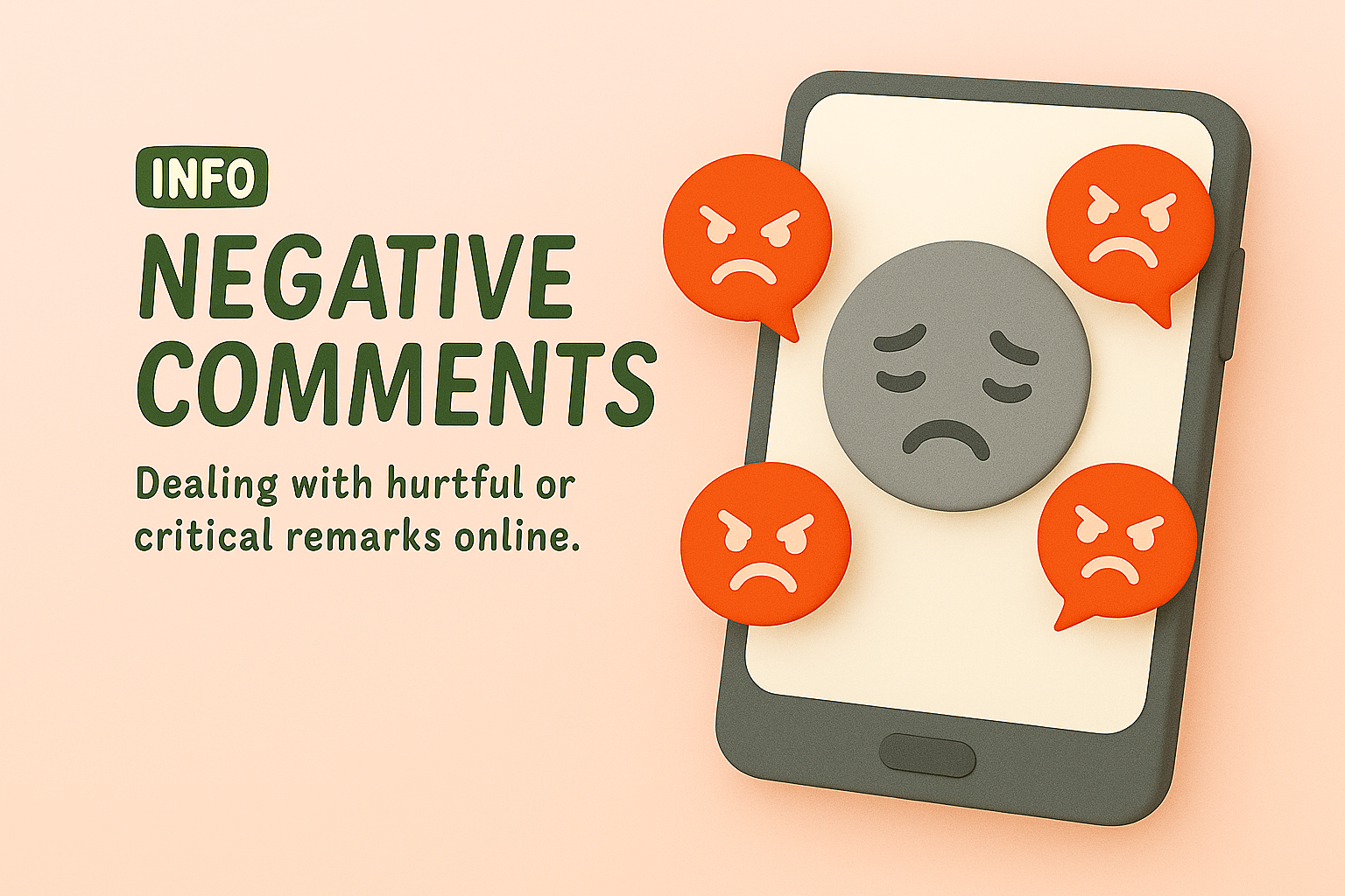 /Collection: /by davooda/Type: PNG/A visually engaging infographic illustrating the challenges of dealing with negative comments online, featuring a smartphone and expressive emojis. Ideal for mental health awareness or social media guidance.