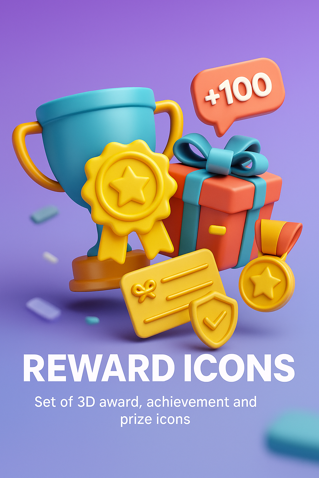 A vibrant collection of 3D icons representing awards, trophies, and achievements, featuring a trophy, badges, and gifts against a smooth gradient background.
