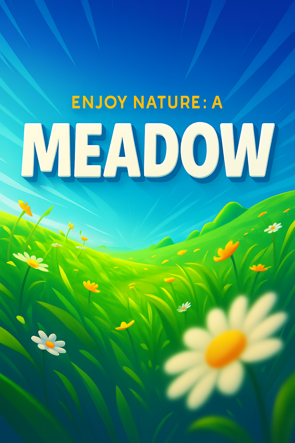 /Collection: /by davooda/Type: PNG/A lively meadow scene featuring a bright blue sky and lush green grass, with dynamic rays emanating from the center. The title 'ENJOY NATURE: A MEADOW' is prominently displayed in a bold, engaging font.