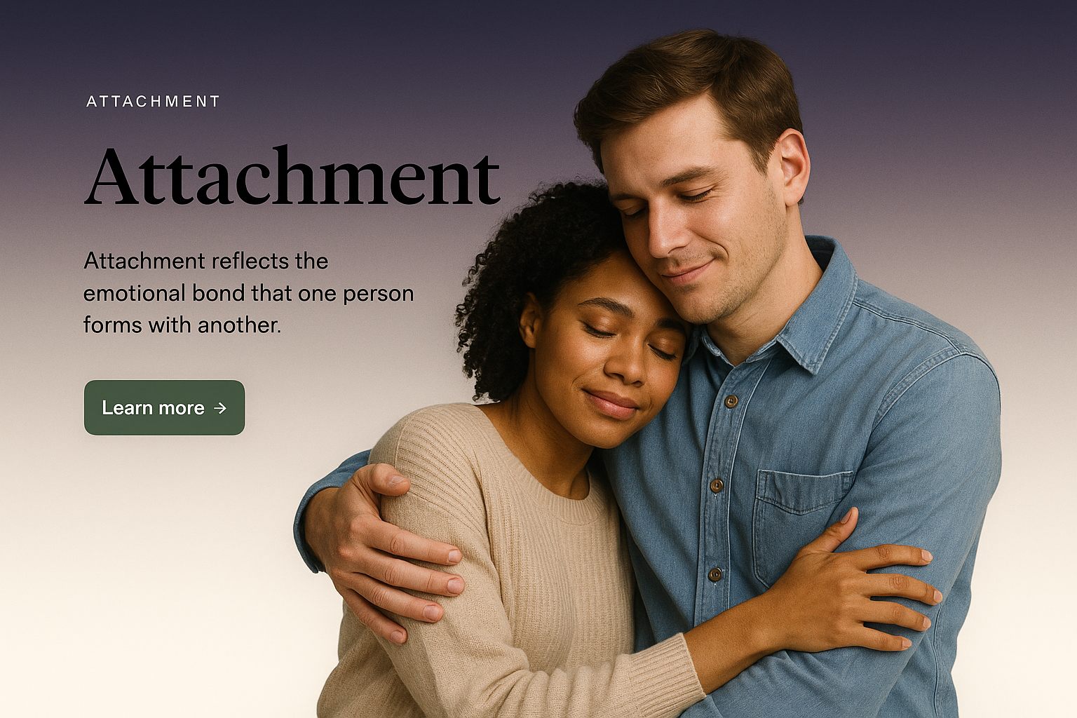 A stylish web page design featuring a warm illustration of a couple embracing, symbolizing attachment. The background has a gradient from dark to white, enhancing text readability.