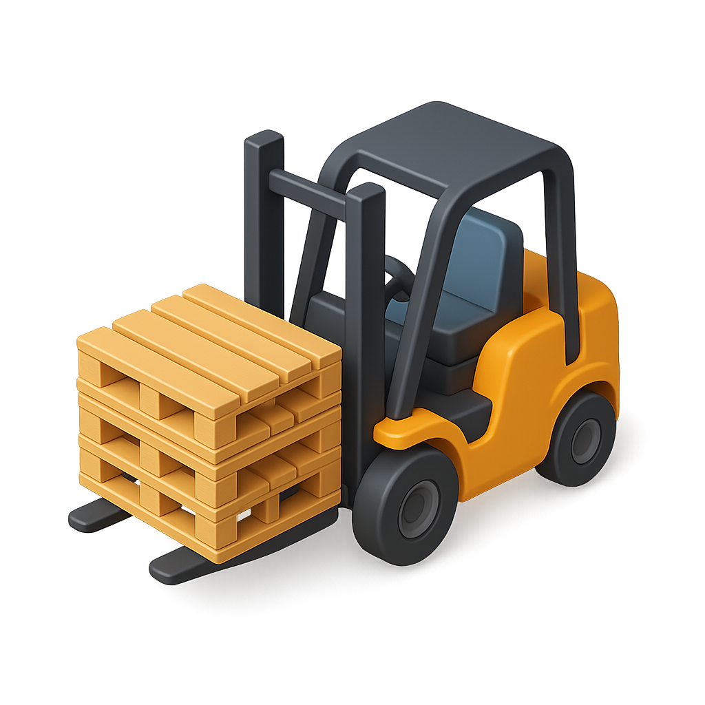 A vibrant 3D icon of a forklift carrying wooden pallets, designed with a three-quarter isometric view. The icon features a sleek, modern aesthetic with a transparent background.