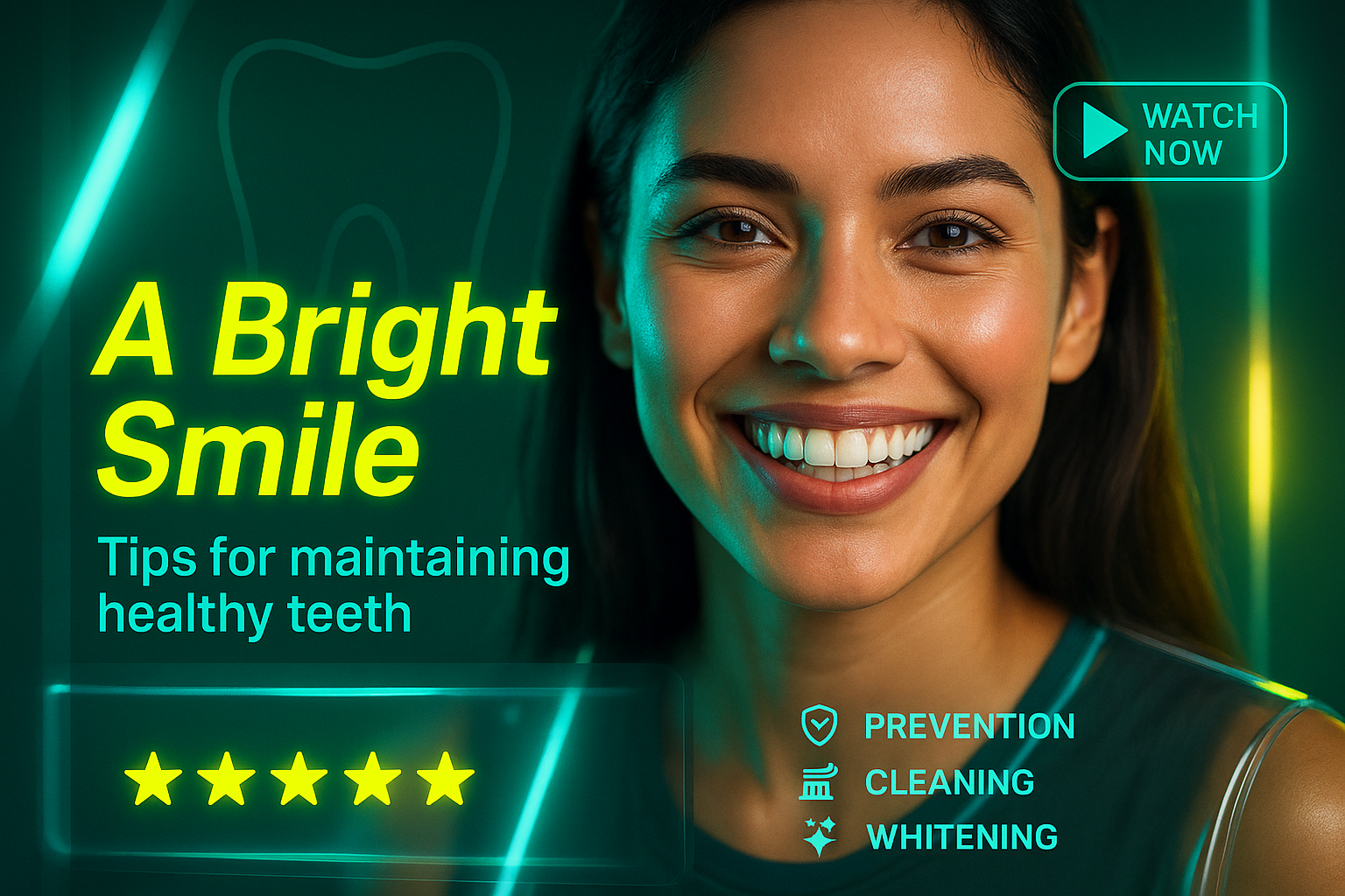 /Collection: /by davooda/Type: PNG/Vibrant promotional graphic featuring a smiling individual, focused on dental health tips. Ideal for social media or health blogs, it emphasizes prevention, cleaning, and whitening.