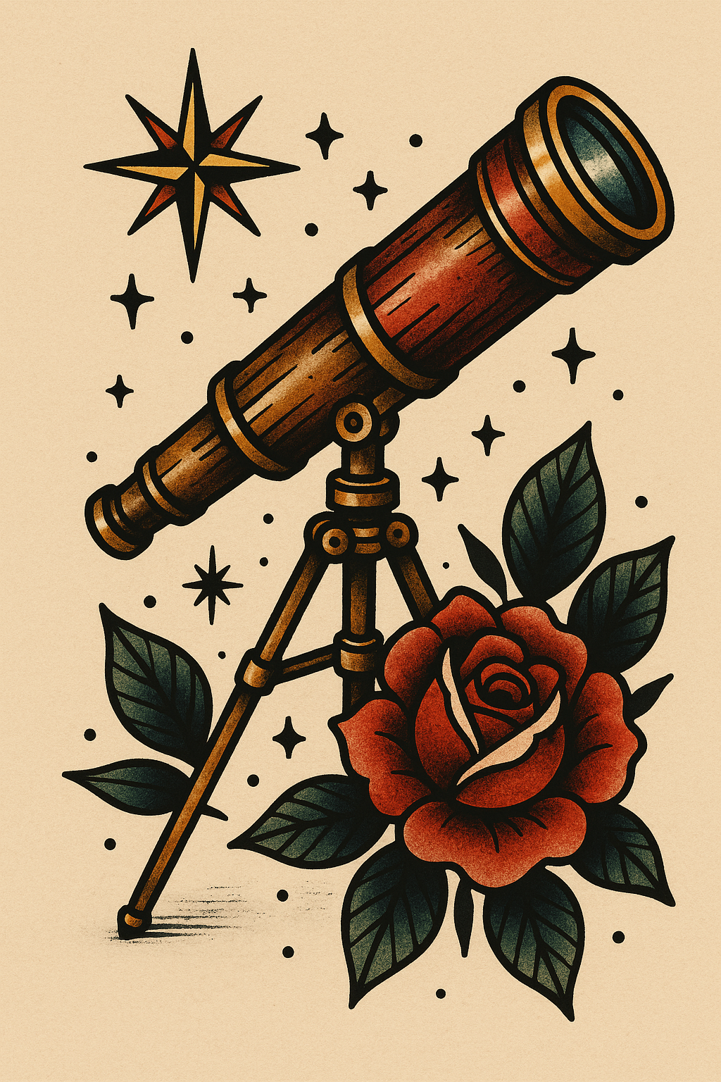 This image features a vintage-style telescope surrounded by a rose and stars. It blends nature and astronomy, ideal for art prints or educational materials.