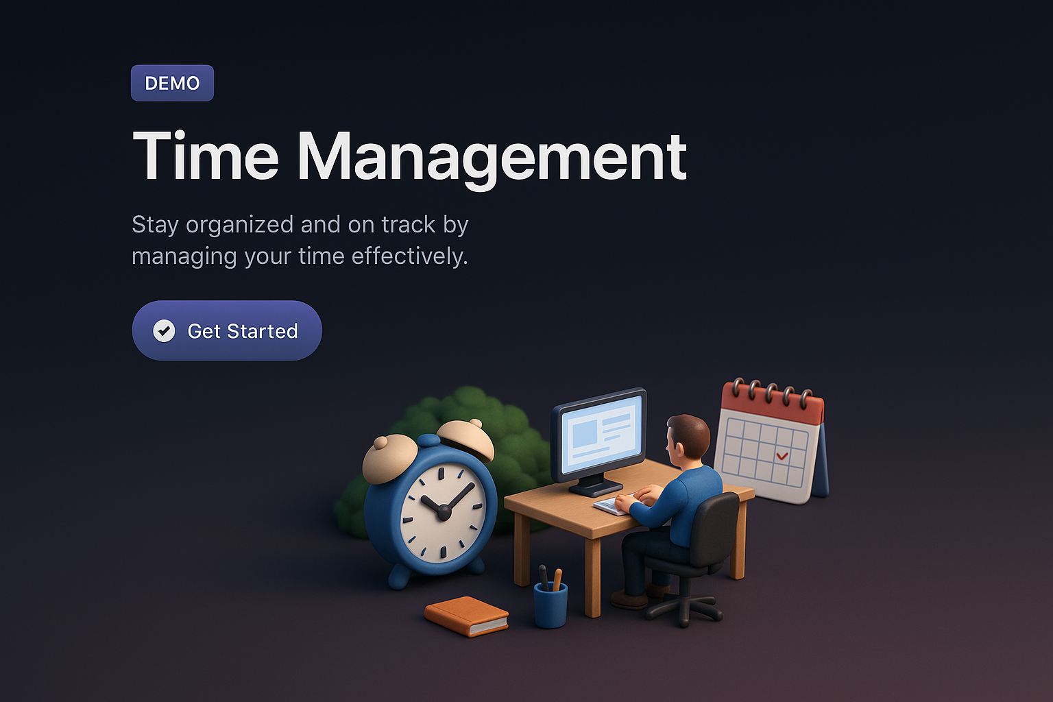 A detailed 3D scene depicting a person managing time at a desk, featuring a clock and calendar. The design emphasizes realism and effective time management.