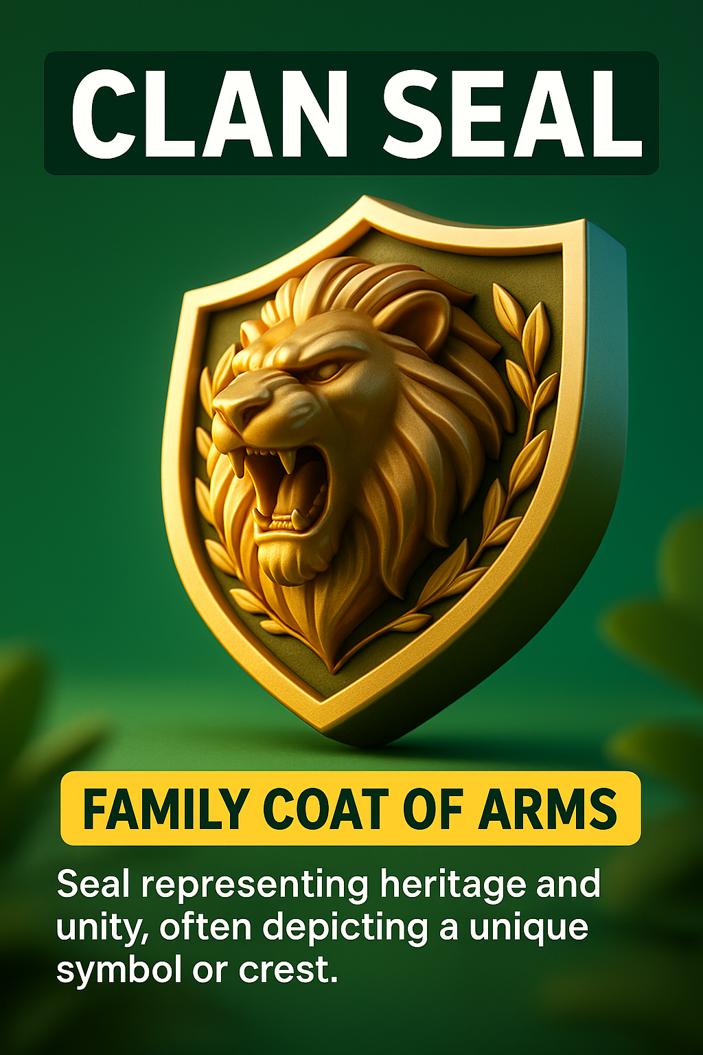 /Collection: /by davooda/Type: PNG/A detailed 3D illustration of a clan seal featuring a lion's head, set against a smooth gradient background. The design incorporates bold text and engaging visual elements to represent heritage.