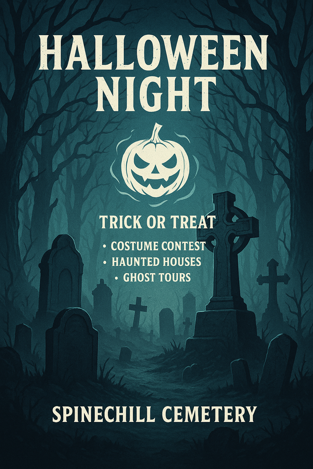 A vibrant Halloween event poster featuring a haunted graveyard scene, perfect for promoting spooky activities and gatherings during the Halloween season.
