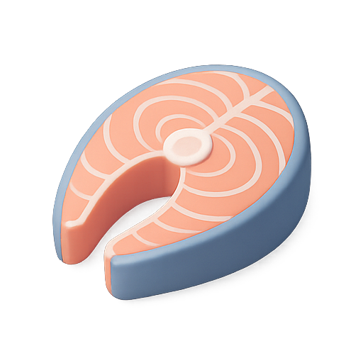 A playful rubber toy designed in the shape of a salmon slice, featuring a soft color palette and fun spiral patterns, ideal for children's playtime and sensory development.