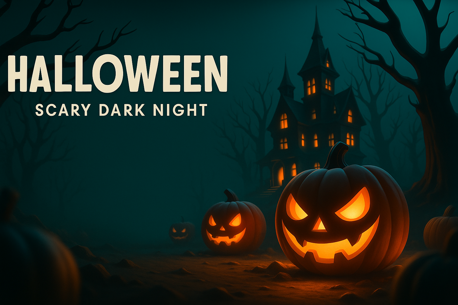 /Collection: /by davooda/Type: PNG/A chilling Halloween scene featuring glowing evil pumpkins and a haunted house set against a dark forest backdrop. The atmosphere is spooky, perfect for Halloween.