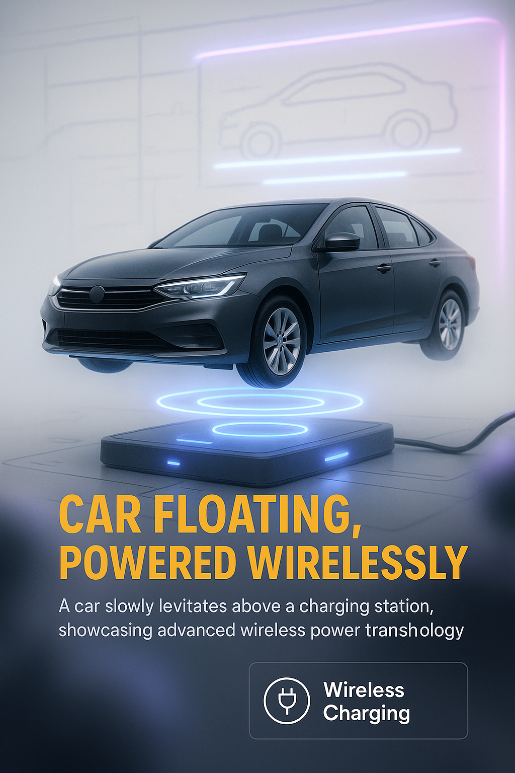/Collection: /by davooda/Type: PNG/A visually striking depiction of a car levitating above a wireless charging station, illustrating innovative technology in electric vehicle charging. The futuristic style appeals to tech enthusiasts and automotive industry professionals.
