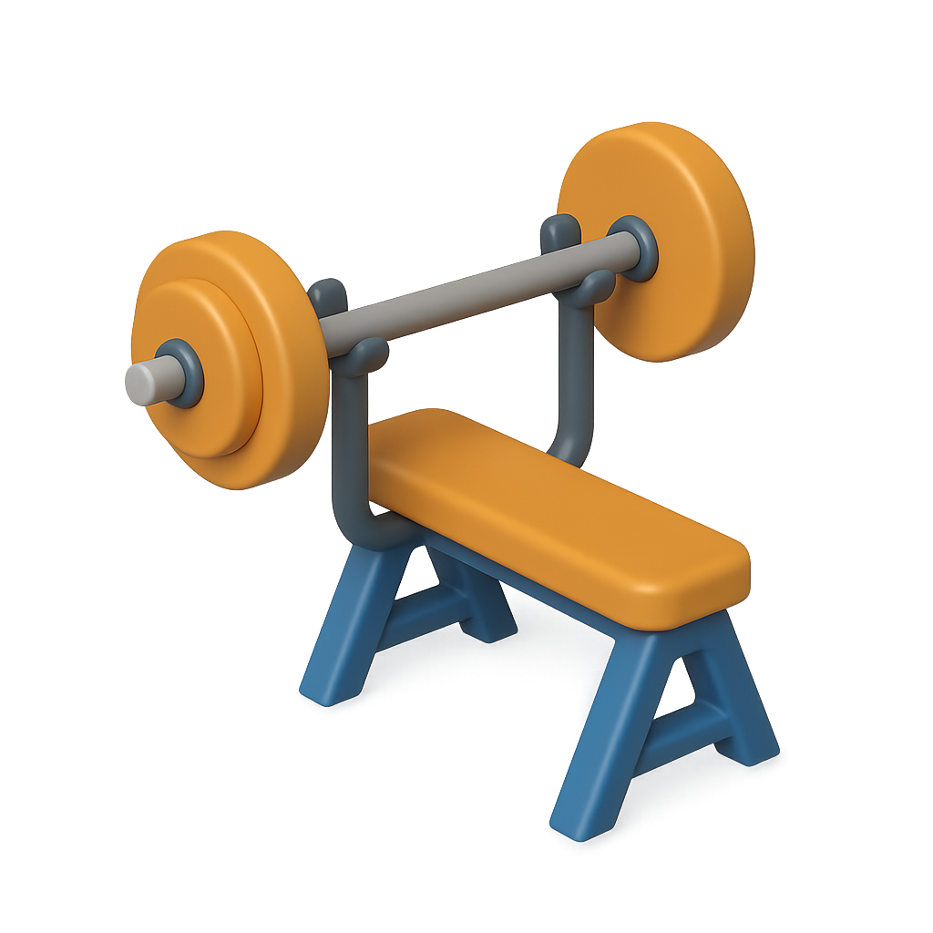 /Collection: /by davooda/Type: PNG/A three-dimensional isometric representation of a bench press setup, featuring a barbell with weights and a bench. The design incorporates a vibrant orange and blue color scheme against a soft gradient background.