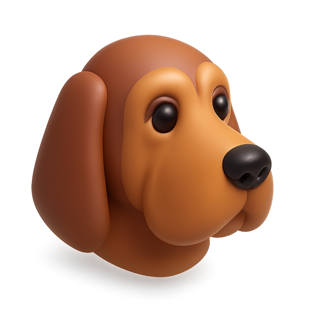 A stylized 3D icon of a bloodhound's head, featuring smooth curves and a friendly expression. The design showcases a three-quarter view with a volumetric feel against a subtle gradient background.