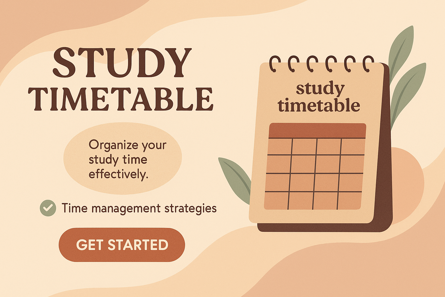 A visually appealing landing page slide featuring a study timetable in a boho style. The design includes a spiral notebook with a calendar, a warm color palette, and engaging text elements.