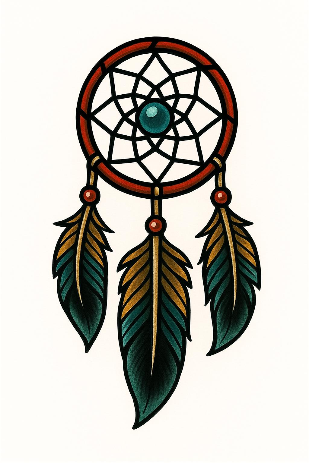 A vibrant illustration of a dreamcatcher featuring intricate webbing and colorful feathers. Ideal for art prints, tattoo designs, and cultural representations.