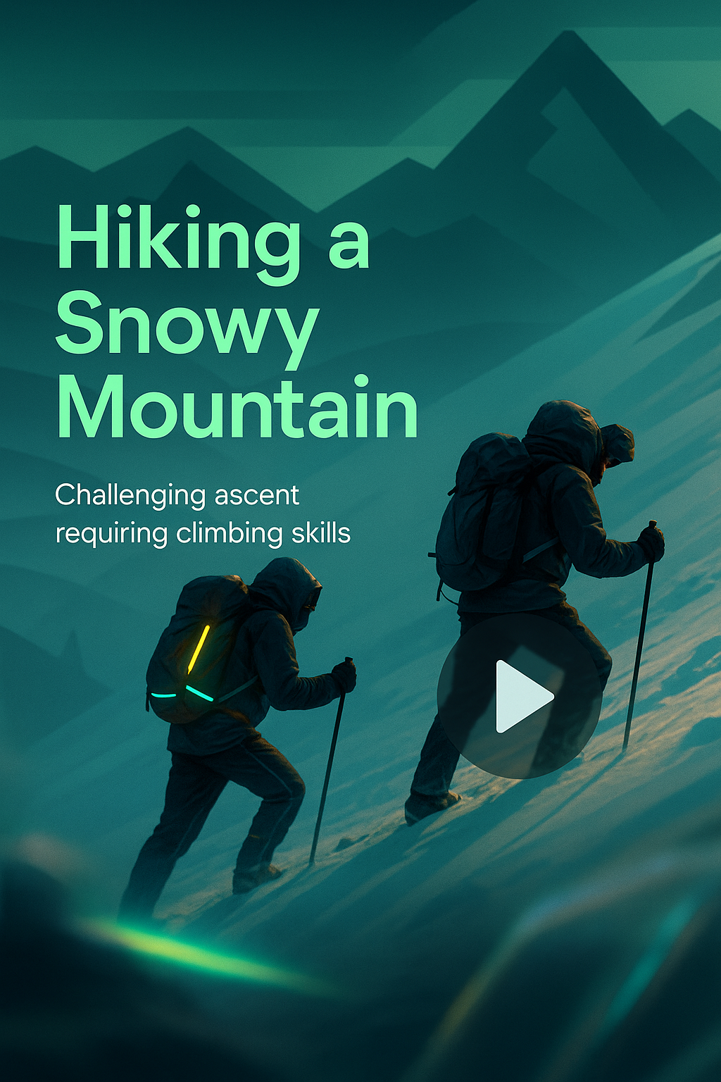 Engaging visual depicting climbers ascending a snowy mountain, showcasing the challenge and adventure of hiking in winter conditions. Suitable for outdoor activity promotions.