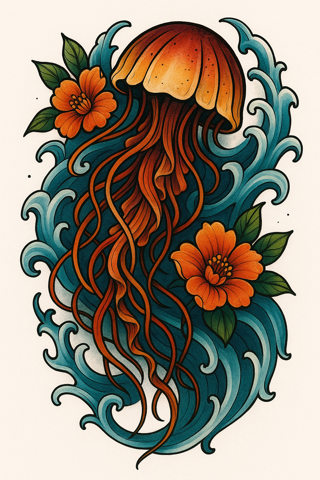 A colorful and detailed illustration of a jellyfish surrounded by stylized waves and flowers. This artwork is perfect for tattoo designs or ocean-themed art.