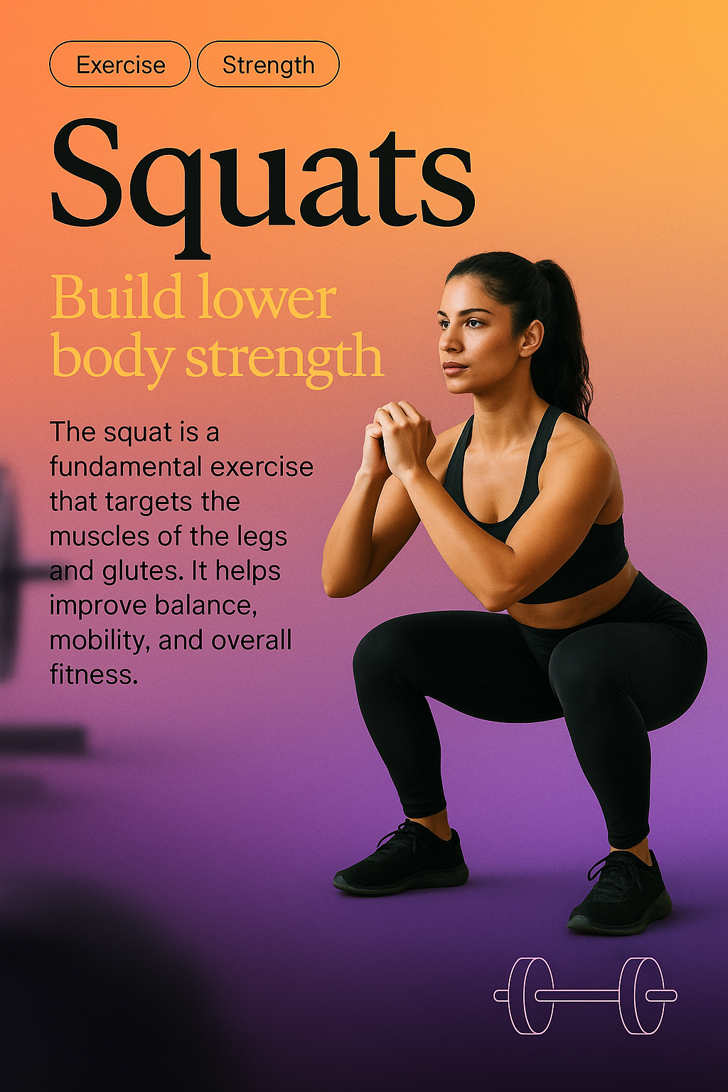 /Collection: /by davooda/Type: PNG/A vibrant landing page design featuring a fitness model demonstrating squats. The layout includes a bold title, subtitle, and a gradient background with engaging text elements.