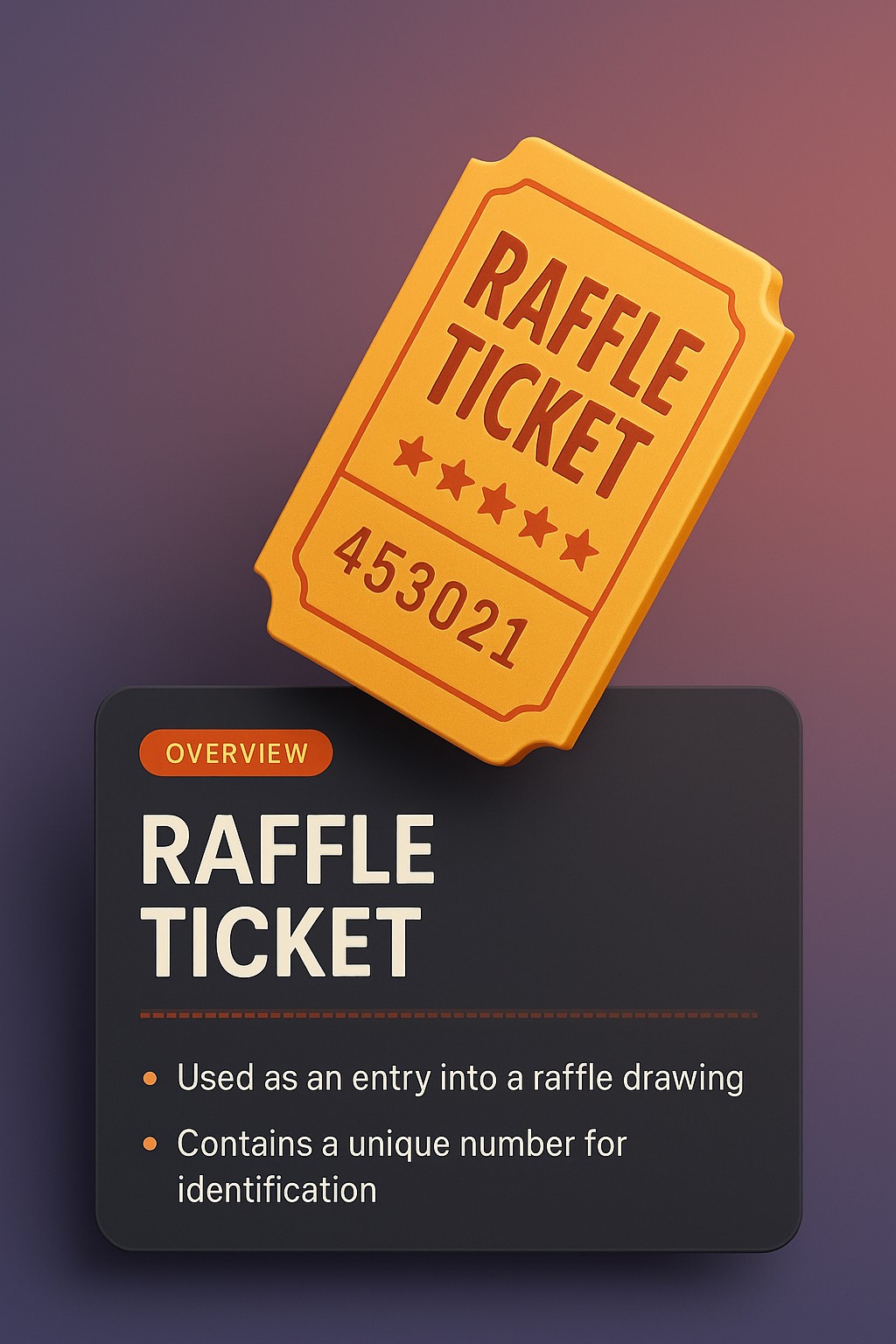 A 3D illustration of a raffle ticket with an orange hue, placed above a dark informational block. The block features an overview and a unique number for identification.
