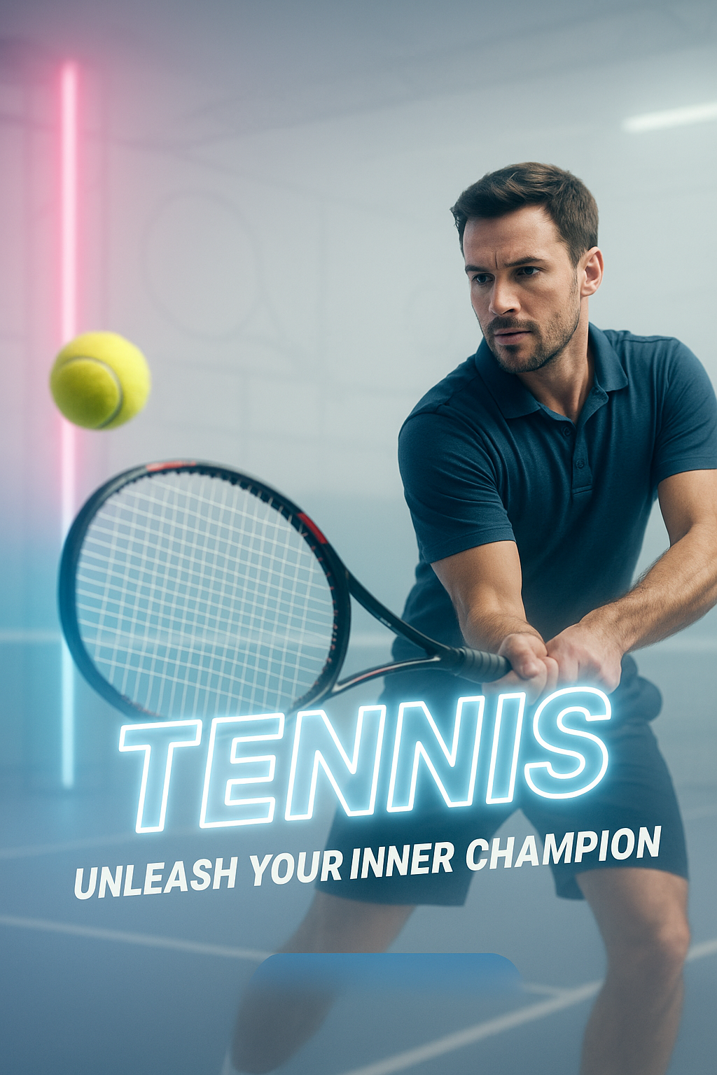 Energetic sports-themed image showcasing a male tennis player in action, ideal for promoting tennis-related content or events with a modern and motivational design.