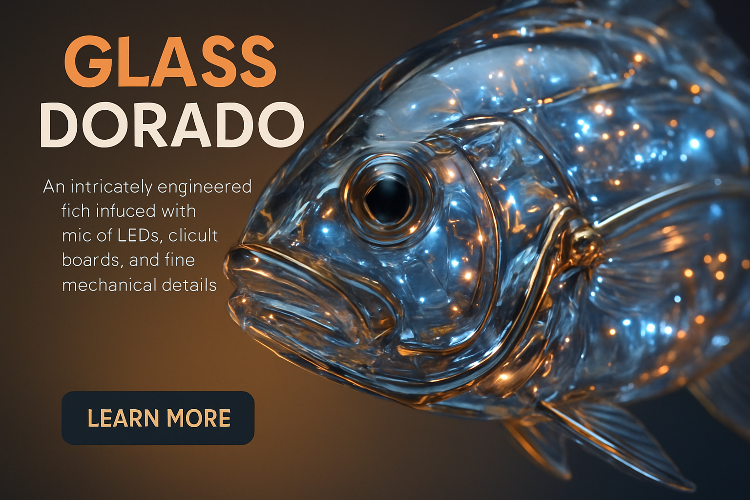 This image showcases a hyperrealistic close-up of a Dorado fish, crafted with a glass-like texture. It features intricate LED lights, circuit boards, and metallic components, all illuminated beautifully.